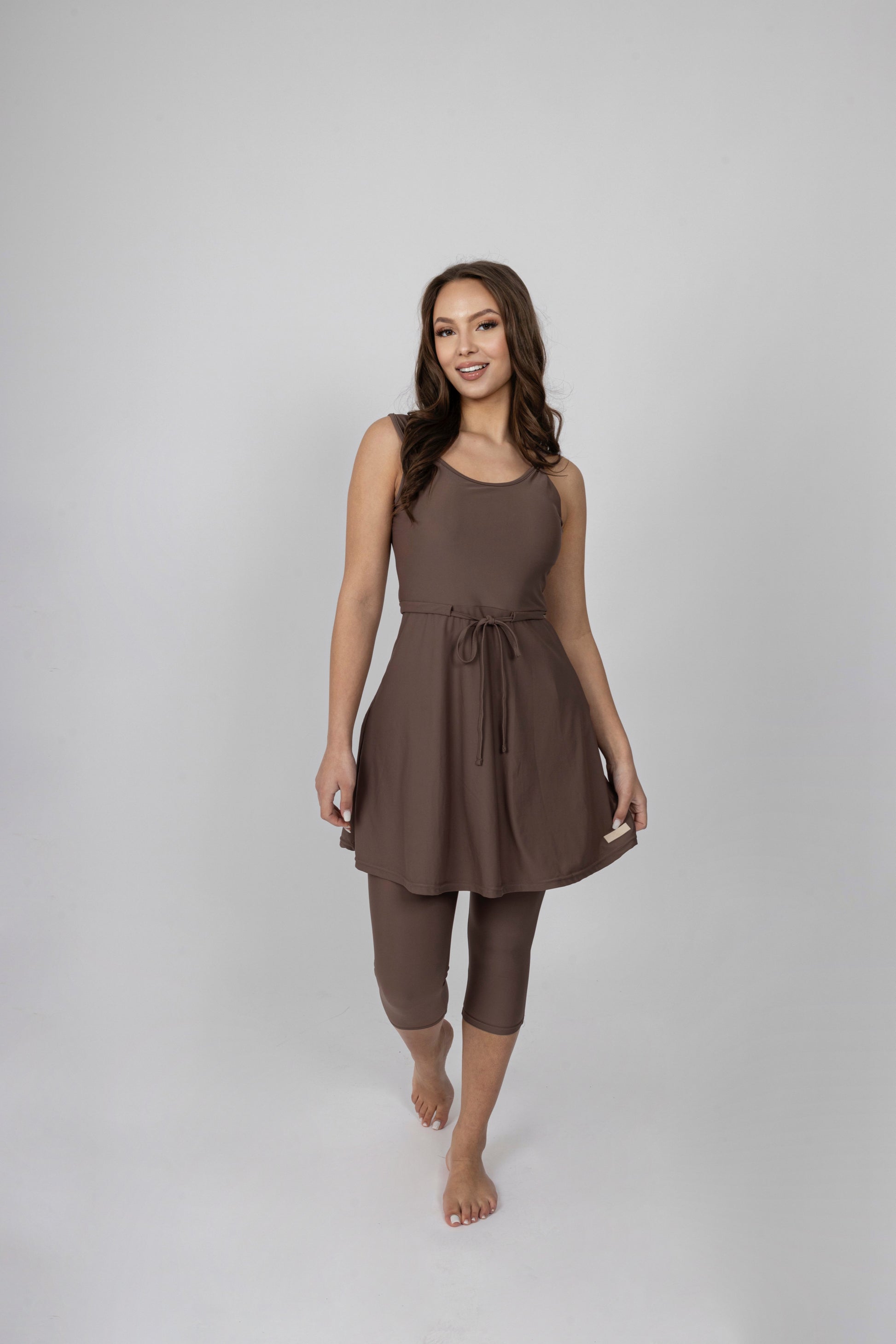 Ontdek het nieuwe tijdloze ontwerp van Sisi Swimwear, genaamd Mira. Deze 2-delige set bestaat uit een elegante mouwloze zwemjurk met een koord bij de taille, een twist bij de mouw en een 3/4 zwemlegging.